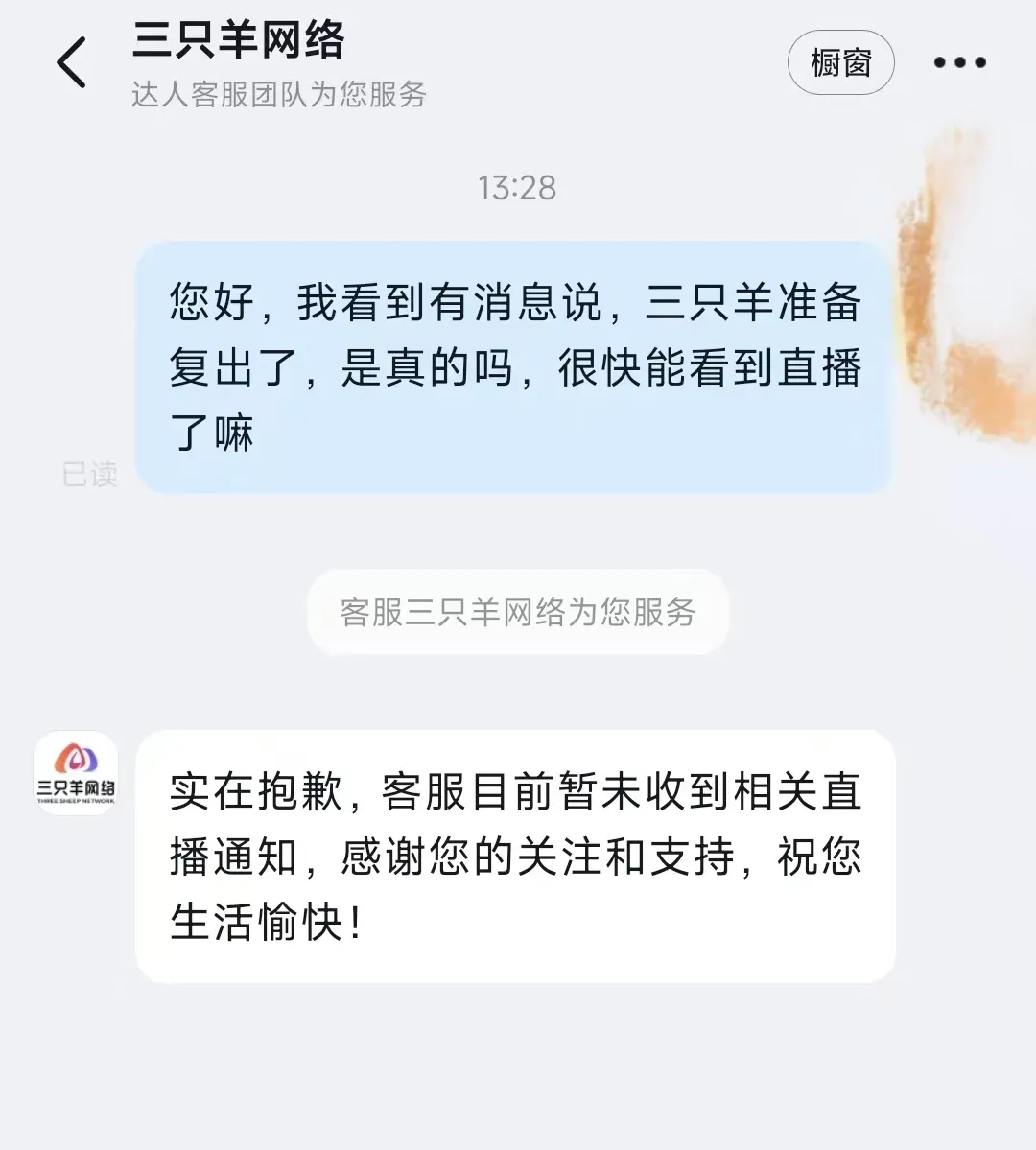 现代快报记者曾向三只羊网络进行求证,客服表示“目前暂未收到相关直播通知”。记者注意到,早在3月23日,合肥市联合调查组曾发文表示,经三只羊公司申请,合肥市联合调查组组织相关主管部门和律师、消费者代表等进行综合评估,认为三只羊公司整改符合要求,具备恢复经营条件。